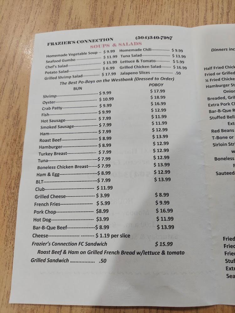 Welcome to Frazier's Connection, a delightful family restaurant located in Marrero, LA. Enjoy a diverse selection of local specialties and an extensive tea menu in a relaxed and inviting atmosphere. Perfect for lunch or dinner, our quick service makes it ideal for solo diners and groups alike. With options for takeout, delivery, and dine-in, we cater to your every need. Our accessible facilities ensure everyone can enjoy our delicious offerings, ranging from traditional cuisine to healthy bites. Don't forget to check out our bar for a refreshing cocktail or a fine wine. Join us for a memorable dining experience!